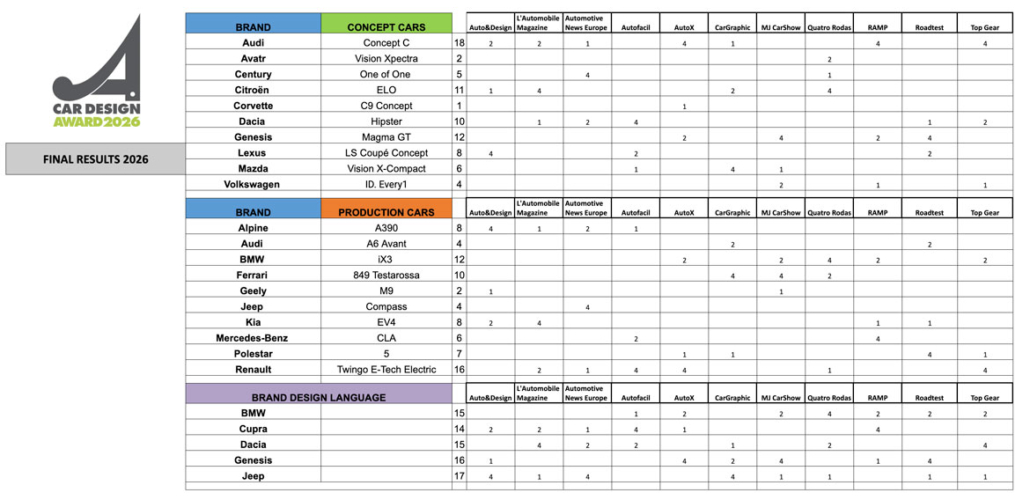 2026 CAR DESIGN AWARDS GO TO AUDI, RENAULT AND JEEP